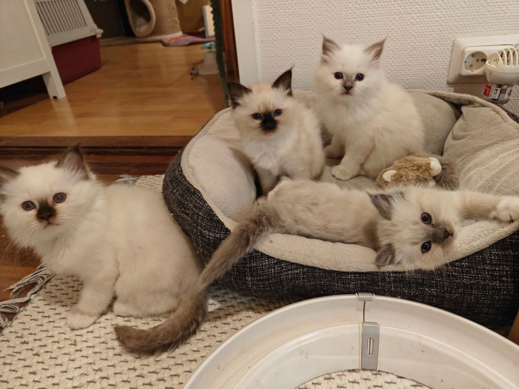 Loppu kesä/ syksy kahden sisaruksen pentueet kissalaan. Emot kilppareita ja uros ruskeanaamio.